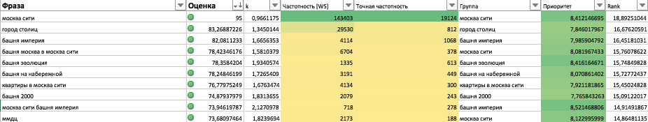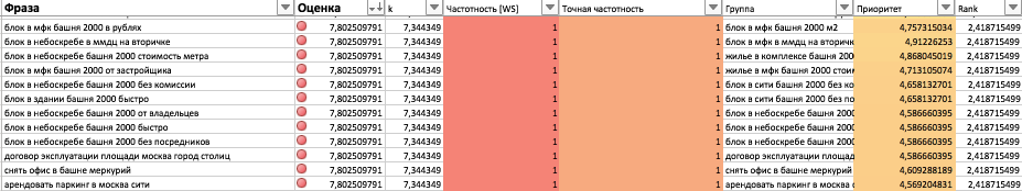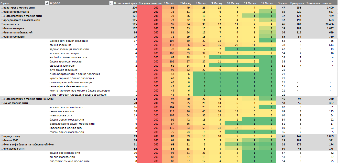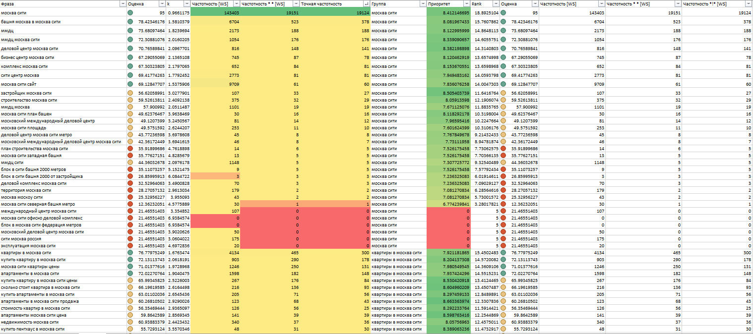 Работать по семантике из 1 040 запросов «всё подряд» — значит тратить месяцы впустую. В элитной недвижимости каждый кластер стоит времени команды копирайтеров и внутренней аналитики. Мы сразу заложили приоритизацию — какие запросы брать в первую очередь, какие во вторую, а какие вообще не трогать.