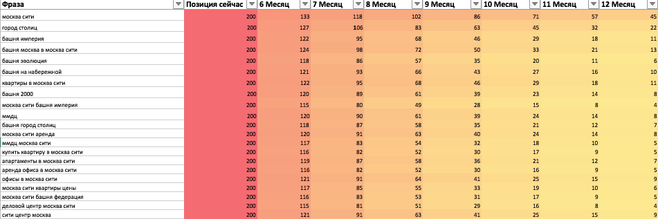 Прогноз позиций — сигма-функция с коэффициентами от якоря конкурентности. На выходе по каждой фразе получаем ожидаемую позицию через N месяцев и соответствующий трафик. Это даёт план работ с привязкой к срокам.